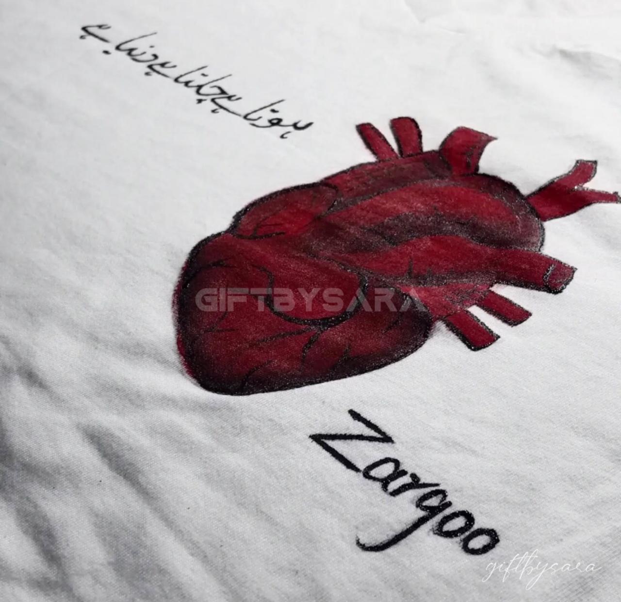Unique handpainted t-shirt featuring a detailed heart illustration and love quote in English and Arabic. Perfect for gifting or personal wear.