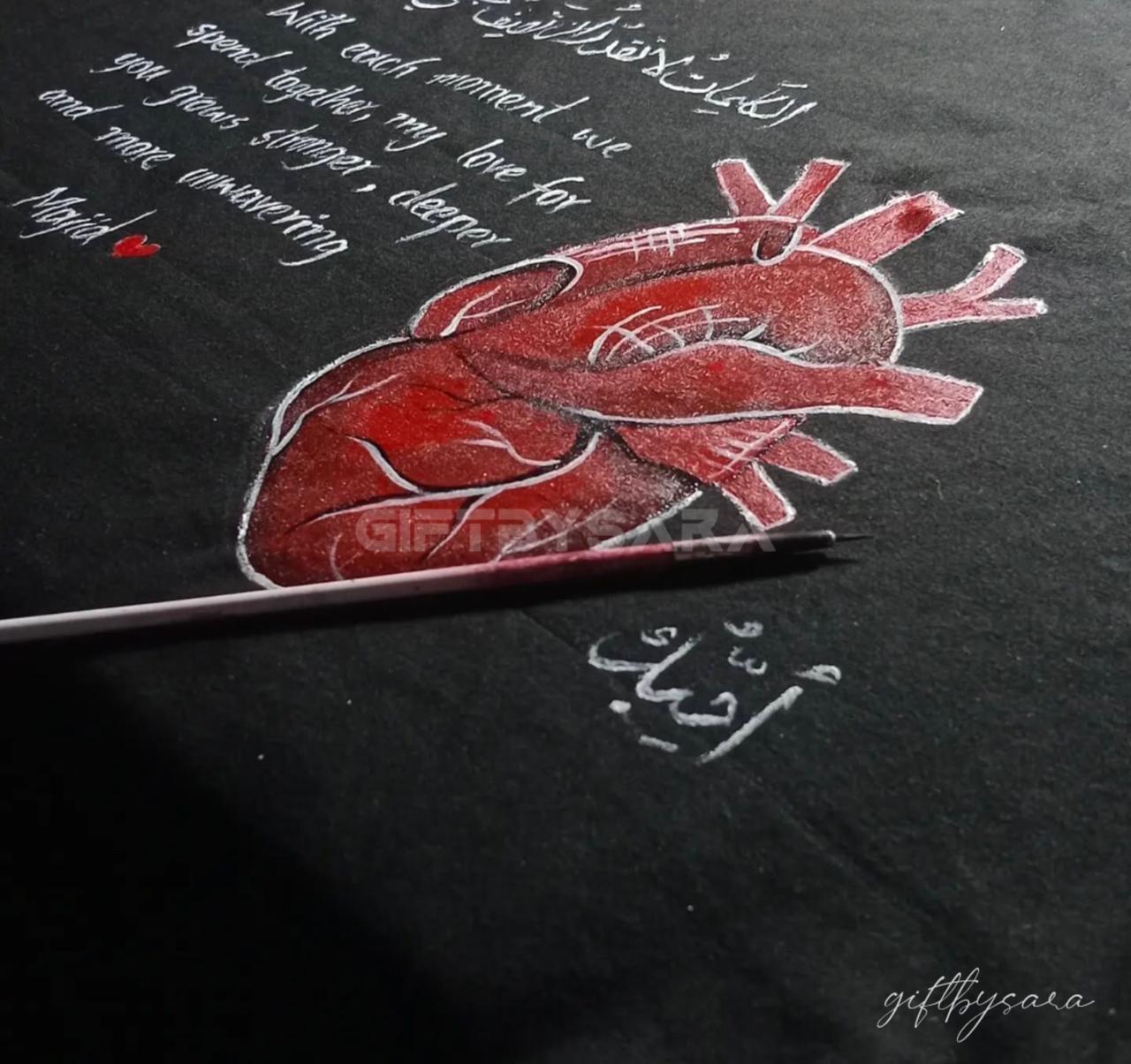 Unique handpainted black t-shirt featuring a detailed heart illustration and love quote in English and Arabic. Perfect for gifting or personal wear.